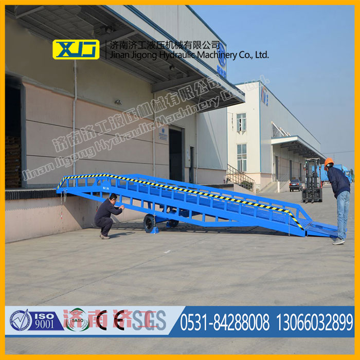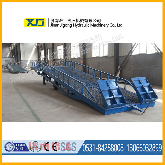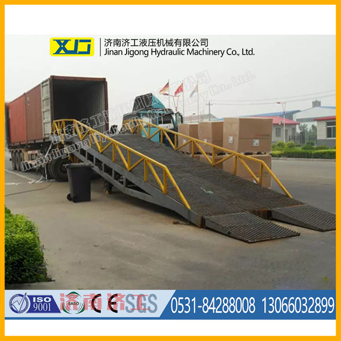 移動式登車橋用于貨物裝卸位置不固定場合的用貨物裝卸輔助設備,是實現貨物裝卸的專用物流機械,通過它使叉車等搬運車直接進入貨車、列車車廂裝卸貨物,在提高工效的同時又能充分保障作業安全。